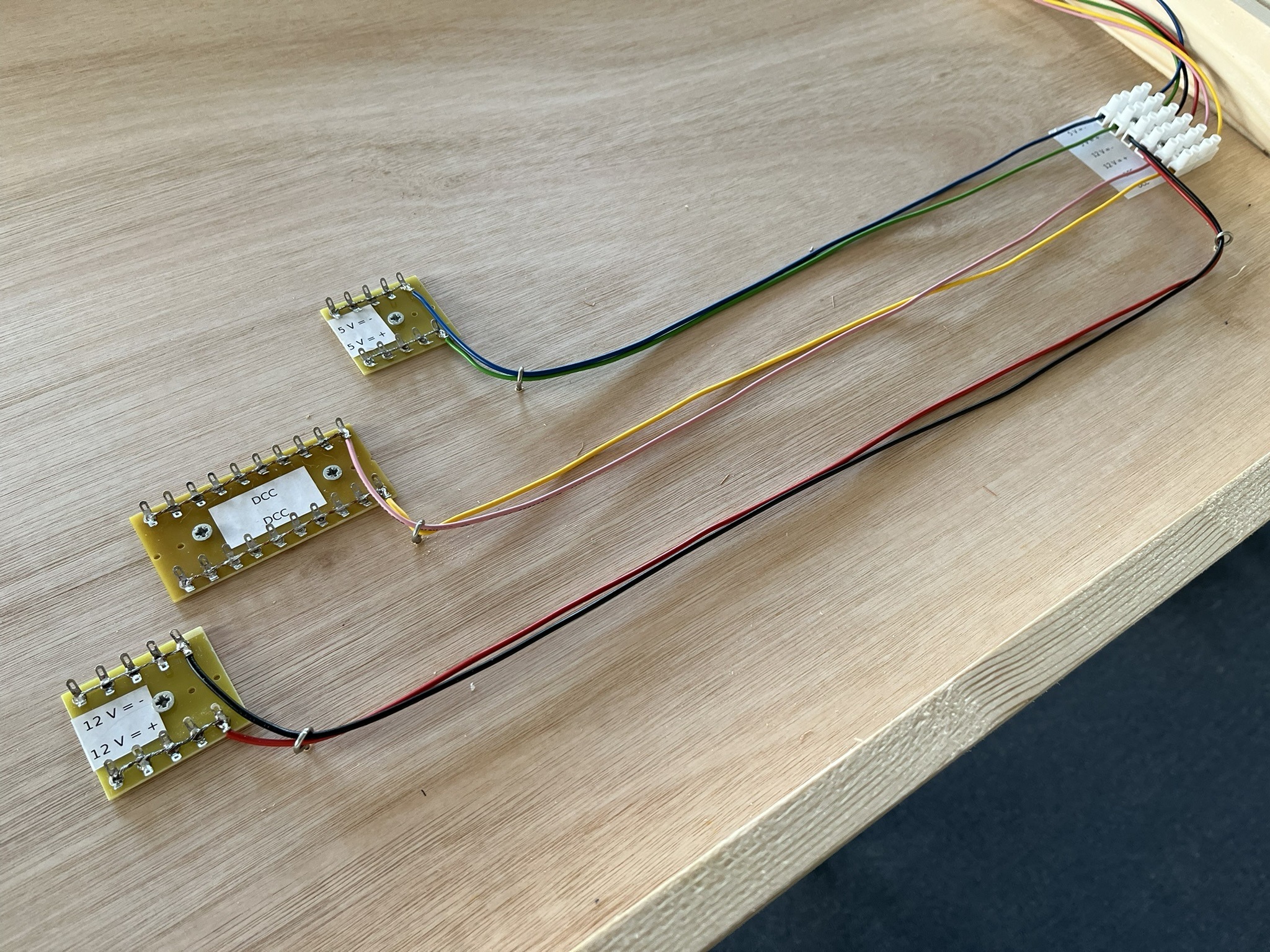 Voor het verbinden van de module bakken gebruik ik kroonsteen-strips met pen en gat verbindingen. Deze zijn te koop in sets van twaalf verbindingen. Ik gebruik er maar zes, gelukkig zijn ze makkelijk te snijden. Zie de afbeeldingen voor de spanningen.